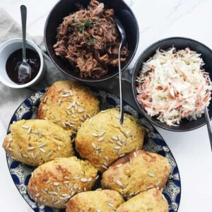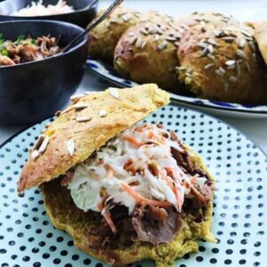 Jeg har både lavet grovbollerne til frokost og sandwichboller til madpakken. Noget min kæreste var utrolig begejstret for. Derudover eksperimenterede jeg også med en burgerbolle i en sundere udgave. De blev faktisk mildest talt fantastiske. Både grøntsagerne, ingefæren og gurkemejen, giver ekstra smag og karakter til bollen, og gør sig perfekt med krydret kød som pulled pork. Udover pulled pork serverede jeg også en klassisk coleslaw salat og en hjemmerørt barbecue dressing til. Et perfekt aftensmad måltid, der både indeholdte hjemmebag, grøntsager og fuldkorn.
