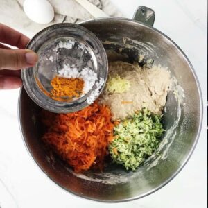 - Riv grøntsagerne og tilsæt dem sammen med gurkemeje til bolledejen
