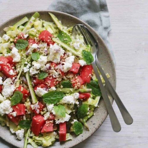 Vandmelonsalat med fetaost og pinjekerner