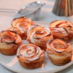 Læg skiver af æbler i midten langs hele strimlen, og bøj dejen indover æblerne, inden den foldes omkring sig selv til du får en rose