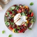 Fordel frisk basilikum på salaten og drys med balsamico glace, salt og peber