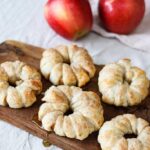 Skær butterdej i lange strimler og fold dem gentagende gange rundt om æblet igennem hullet.