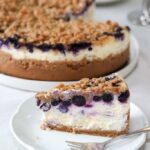 Hæld cheesecake fyldet på den afkølede kiksebund i springformen.Tilsæt derefter blåbær og til sidst crumble, der fordeles udover hele kagen. Kog 1 L vand.Placer springformen med din kage i en ny springform, der er større. Placer så de to springforme i en bageplade, som placeres midt i ovnen. Se billede af opstilling nedenfor. Fyld nu kogende vand i bradepanden og bag kagen i ovnen ved 165 grader almindelig ovn i ca. 1 time og 30min. Hæld cheesecake fyldet på den afkølede kiksebund i springformen