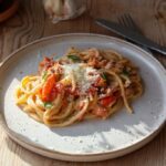 Vend den kogte spaghetti i den cremede sovs. Tilsæt lidt pastavand, til pastaretten har den ønskede konsistens.