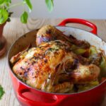 Kyllingen tilberedes i gryden på komfuret, men selve bruningen af kyllingen kan foregå i gryden på komfuret inden grøntsagerne tilsættes, eller til sidst i ovnen. Sidstnævnte giver en virkelig sprød kylling. Hvis du vil tilberede kyllingen udelukkende på komfuret, start så med at stege kyllingen på alle sider i gryden til den bliver gylden på overfladen. Derefter tager du kyllingen op af gryden igen, hælder grøntsager i, og derefter kyllinge på, og fortsætter til næste punkt i opskriften. Hvis du vil bruge ovnen, hælder du først alle grøntsagerne i gryden, og placerer derefter kyllingen ovenpå grøntsagerne, og fortsætter til næste punkt i opskriften uden at stege den af i gryden først. Skær citron i skiver, og placer det ud på kyllingen