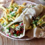 Saml gyros ved at tilsætte tzatziki, stegt gyroskød, salat og fetaost med persille. Server med pommesfrites.