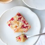 Fordel hindbær skåret i kvarte og resten af den hakkede, hvide chokolade udover kagen