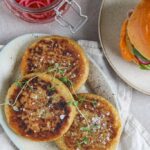 Form kikærtebøfferne i hånden og steg dem på en pande med rigeligt olie. Kikærtebøfferne skal steges i ca. 7min på hver side