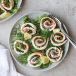 Placer lakserullerne på en tallerken med salat, citron skåret i skiver og frisk dild