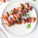 Skær kylling, squash og rødløg i mundrette stykker og vend det i marinaden