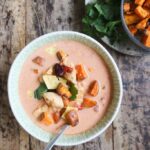 Server den mexicanske suppe med bagt sød kartoffel tern, friske koriander, nachos chips, avokado, brød, cremefraise eller hvad man kan lide