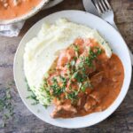 Server mørbradgryden med hjemmelavet kartoffelmos eller ris