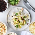 Skær alle grøntsager og frugter i mundrette stykker og server det forskellige tilbehør i hver sin skål