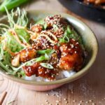 Server sesamkylling med kogt ris, snittet spidskål, chilimayonnaise og sød chilisovs