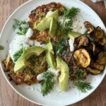 Skær avocado i skiver, grill squash skiver på en varm pande med olivenolie eller airfryer, og top til sidst med creme fraiche dressing og friske urter