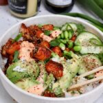 Skær avocado og agurk i tynde skiver, og hak forårsløg fint